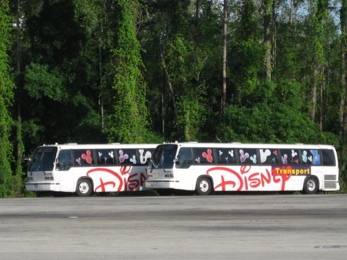 수많은 Disney 버스들이 도시 곳곳으로 부터 사람들을 싫어 나른다.